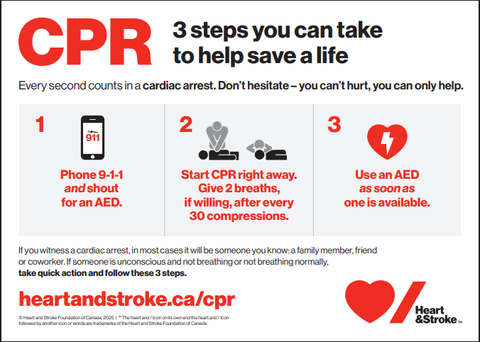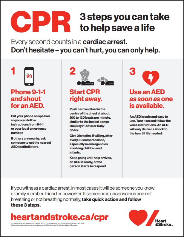 More than 60,000 out-of-hospital sudden cardiac arrests happen in Canada every year. Performing CPR and using an AED can double the chance of survival. Giving rescue breaths/ventilations can be crucial especially in children and infants.